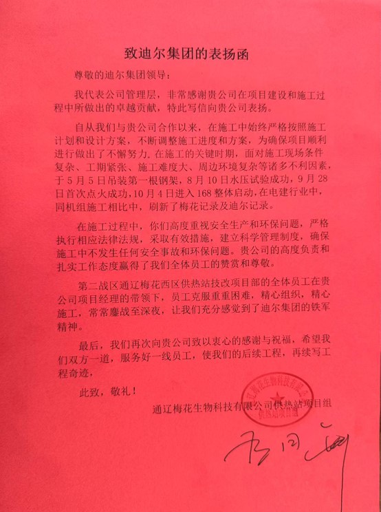 金秋碩果,獻禮國慶。由迪爾集團第二公司承建的通遼梅花西區(qū)供熱站技改項目,于2024年9月28日點火一次成功,于10月4日順利進入168小時整體試運行,受到業(yè)主的高度贊揚。